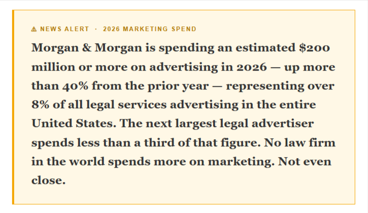 Morgan & Morgan is spending an estimated $200 million or more on advertising in 2026 — up more than 40% from the prior year — representing over 8% of all legal services advertising in the entire United States. The next largest legal advertiser spends less than a third of that figure. No law firm in the world spends more on marketing. Not even close.