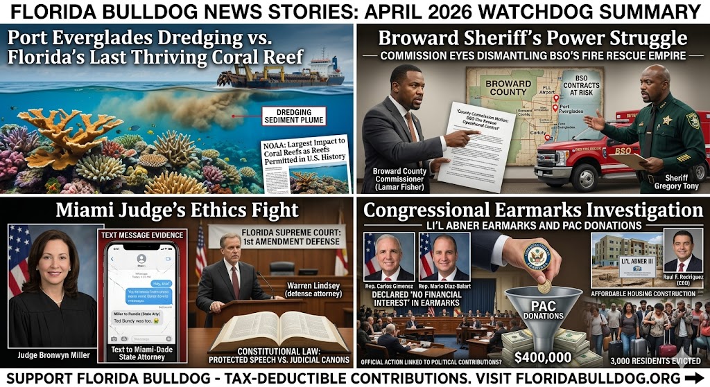 Florida Bulldog, the state’s independent nonprofit investigative newsroom, presents its April 2026 news summary — four essential stories drawn directly from the pages of FloridaBulldog.org and published in the past three months. Each story is the product of original reporting by veteran journalists who follow the public records, documents, and sources that powerful institutions would rather keep out of reach. From an environmental battle over Florida’s last healthy reef to a billion-dollar port project, from a sheriff’s unraveling grip on Broward’s fire and police services to the First Amendment defense of a Miami appeals court judge, to a deeply reported investigation into congressional earmarks that benefited a developer while 3,000 vulnerable residents were evicted — these are the stories that define accountability journalism in Florida in 2026.