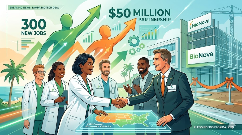TAMPA, FL — BioNova Health Sciences, a rapidly growing Tampa-based biotechnology company specializing in advanced diagnostic testing and personalized medicine, today announced a landmark $50 million strategic partnership with global pharmaceutical leader MedAxis International. The agreement, signed this week at BioNova’s Tampa headquarters, is expected to generate more than 300 new high-wage jobs across the Tampa Bay region over the next three years.